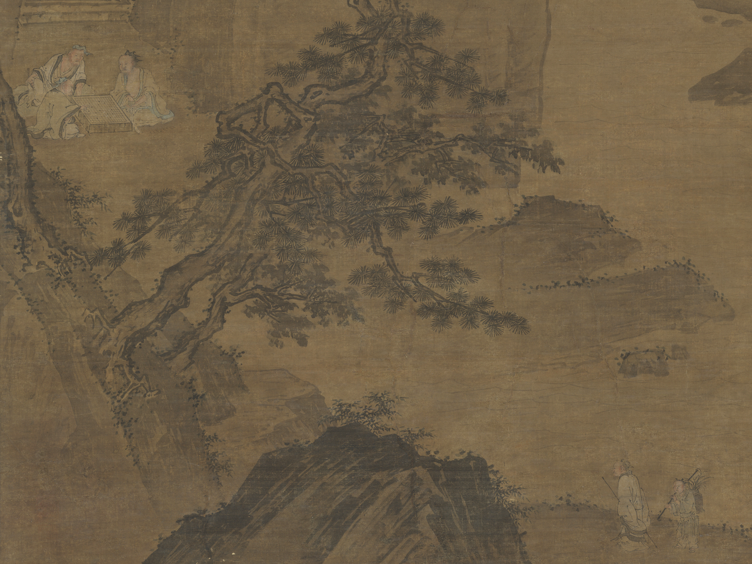 此图无作者款印。画邃谷间雾霭蒸腾,长松掩映,林间隙地上三老弈棋为乐,泉边一老携童采药归来。作者师法马远“大斧劈皴”,以纵放雄浑的笔墨,为四皓营造了一个山水清幽、世外仙境般的居所,衬托出他们去危安命,深隐自适的品行。人物衣纹作“钉头鼠尾描”,虽学南宋“马、夏”,相较于山水背景,用笔细致稳健,但在人物开脸、形神的刻画方面趋于粗放率意而无宋人的精整工丽,无论笔墨或赋彩上都已是典型的明中期面貌。