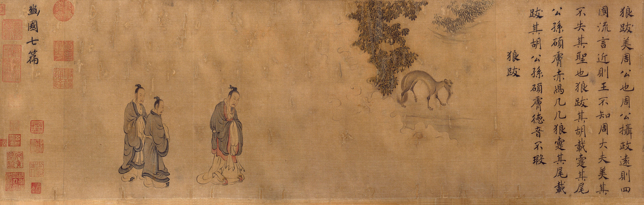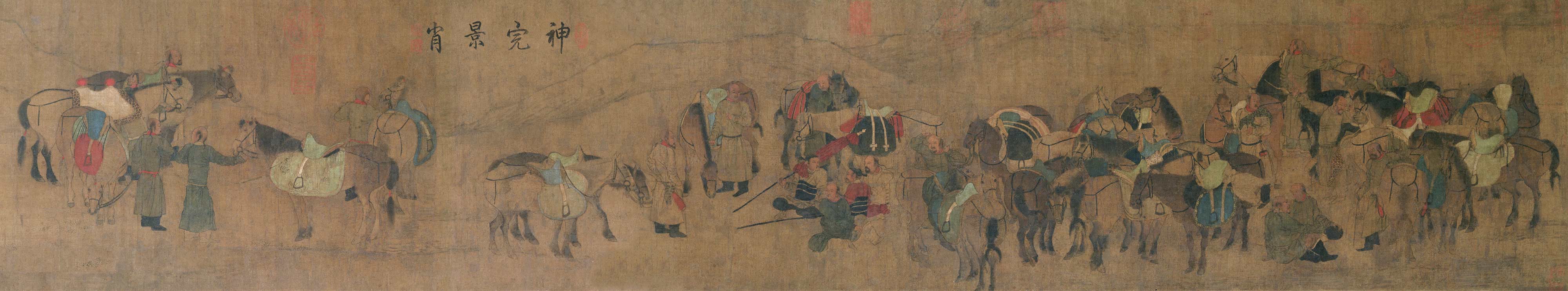 此图传为五代契丹画家胡瓌所画,胡瓌(生卒不详),居范阳(今属河北)。胡瓌与其子胡虔俱善画番部人骑,《宣和画谱》著录胡瓌作品65件,均已佚。此作经清初高士奇《江村销夏录》著录,后收入清高宗内府。