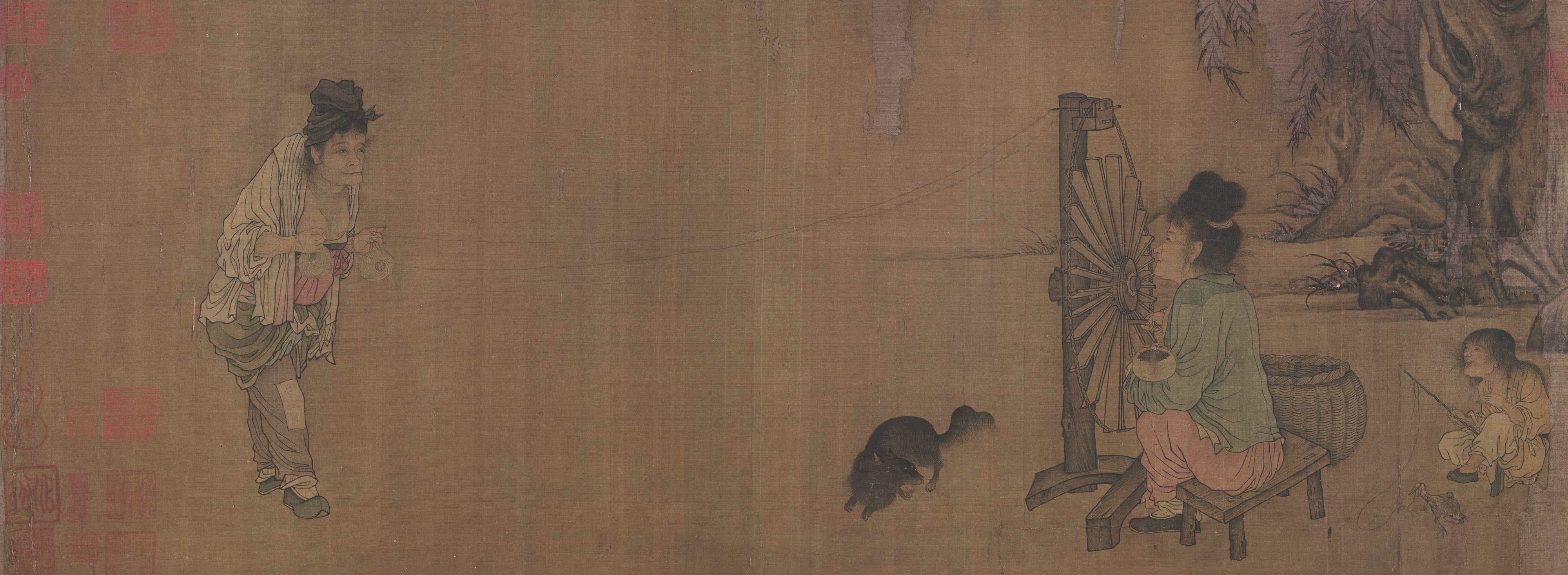 纺车是利用人力将丝、麻等物抽丝延长的工具,在我国有久远的历史。纺车生产通常以家庭为单位,是画家乐于表现的风俗画题材。此图绘村妇纺线场景,画面左侧老妇手持线团,纺车后一位年轻妇女一边哺乳,一边摇动纺车,妇女身后一小孩正在戏三足蟾。该图线条瘦劲,多折笔,设色淡雅。