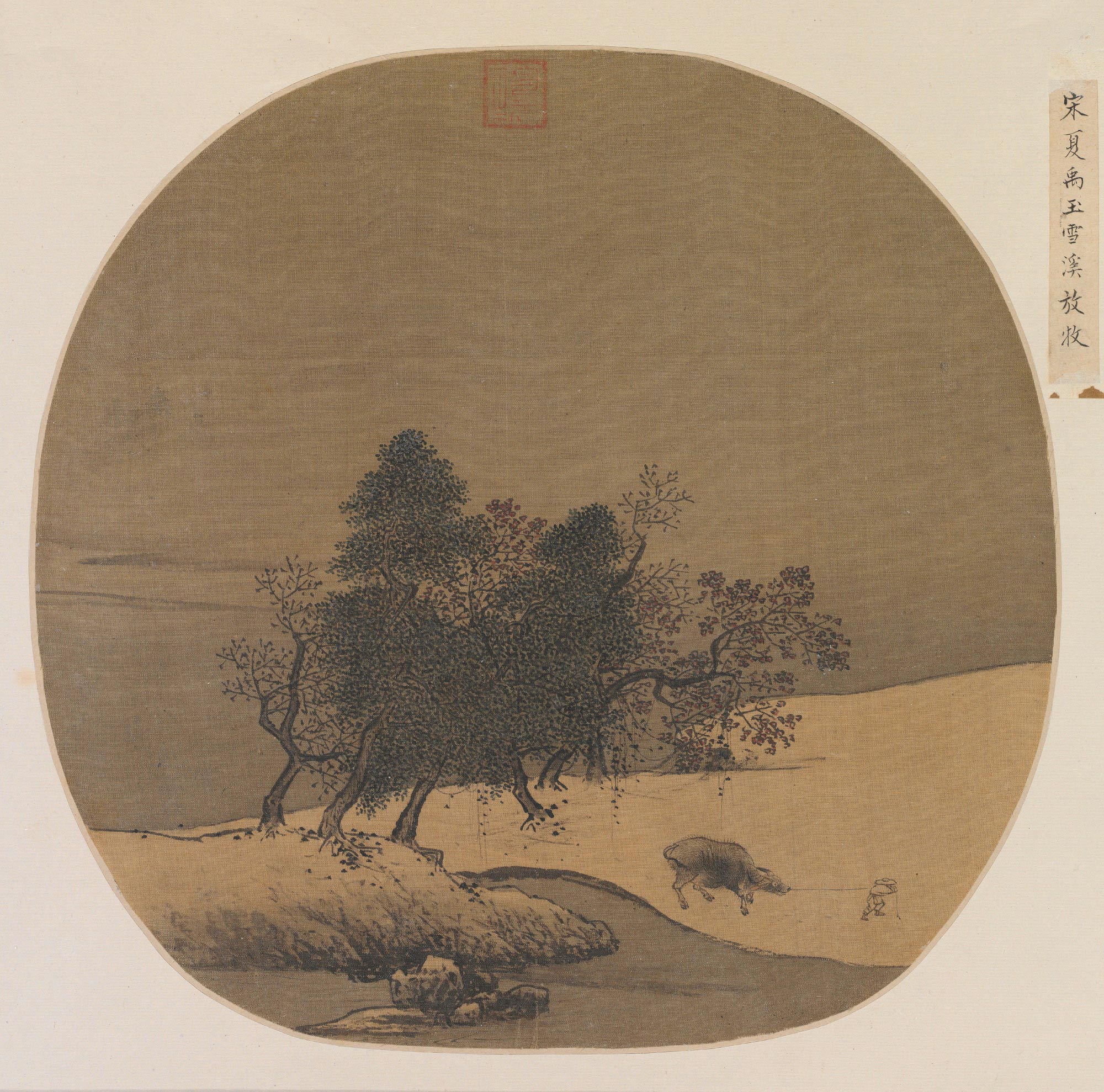 此页选自《宋元集册》第二册第四开,图绘农人雪中放牧之景,以绢色为雪地,淡色渲染天空与溪流,陂石涯岸边几株老树,农人及牛虽用细笔简单勾出,但已具步履艰难之状。