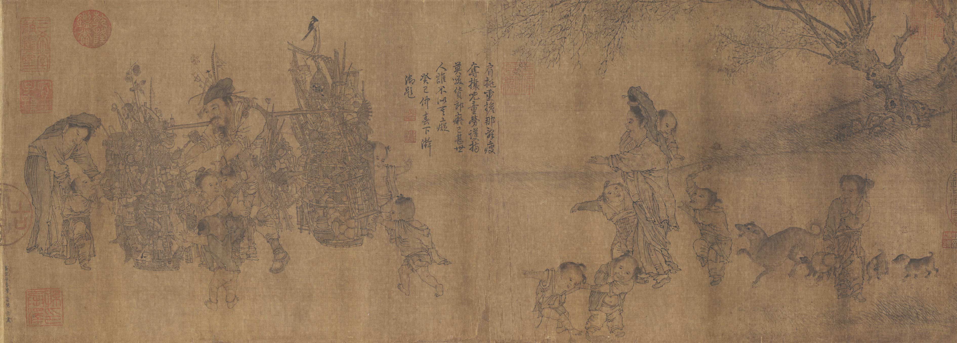 作者款署“嘉定辛未李从顺男嵩画”,即此图作于1211年。本幅有清高宗乾隆皇帝御题诗:“肩挑重担那辞疲,夺攘儿童劳护持。莫笑货郎痴已甚,世人谁不似其痴。癸巳仲春下浣御题。”钤“石渠宝笈”“御书房鉴藏宝”等内府鉴藏印。