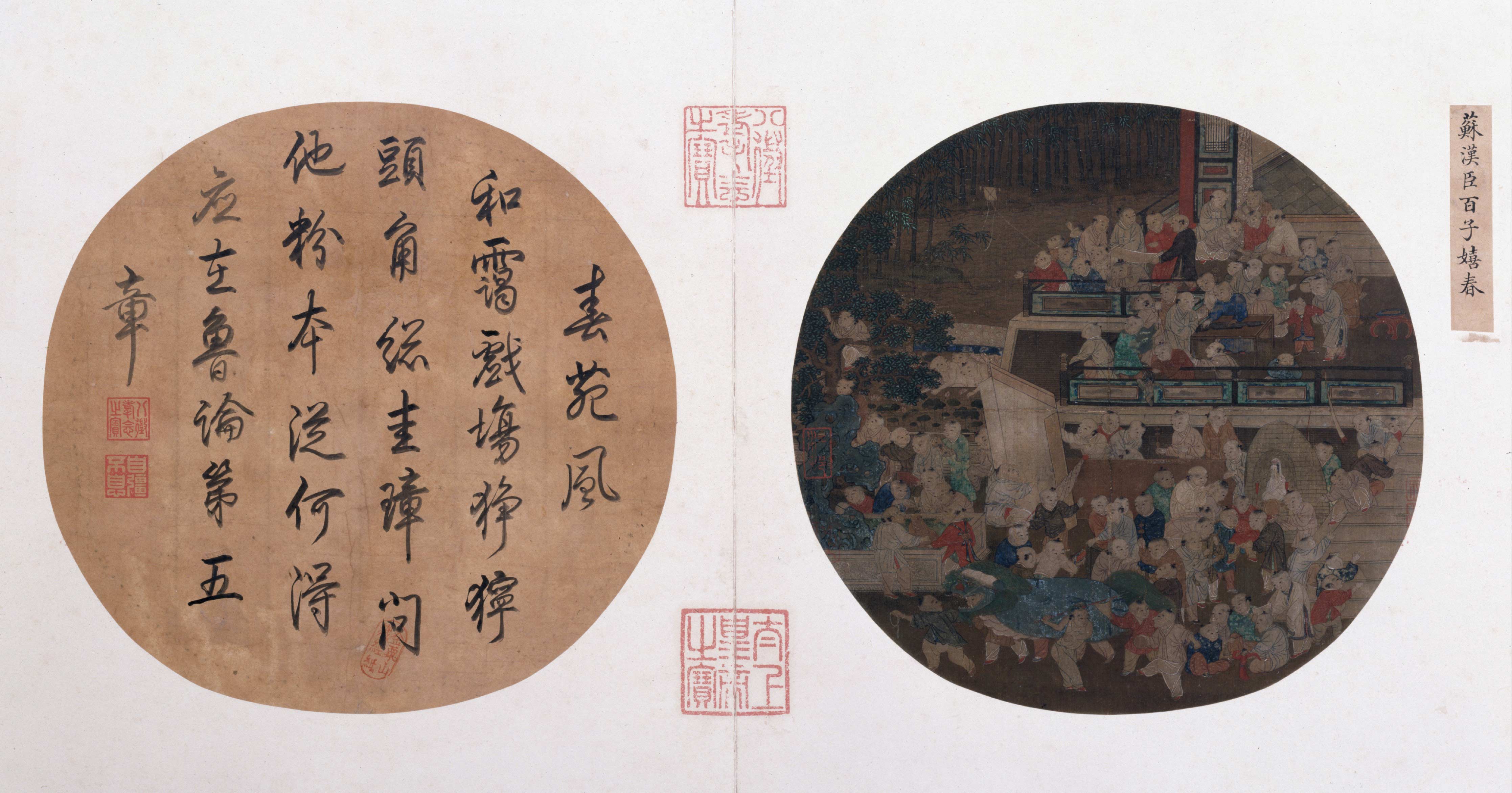 此图选自《四朝选藻•亨册》第四开,旧题“苏汉臣百子嬉春”,实为宋人冒名苏汉臣而作。图绘众多幼童嬉戏场景,有模仿成人鉴古、手谈、礼佛活动,亦有攀条、放风筝、傀儡戏等娱乐活动,画面生动,细节丰富,设色艳丽,孩童比例协调,气氛祥和。