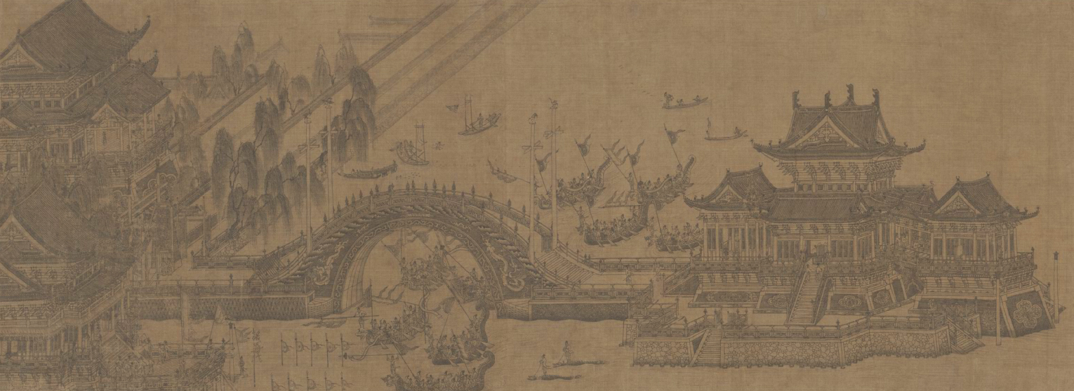 此图绘北宋宫廷在金明池举行龙舟夺标的场景,是宋元时期水嬉的缩影。北宋宫廷一般于三月举行龙舟水嬉活动,《东京梦华录》中有较为详细地记述。图中界画精整,纯用白描,表现出宫殿苑囿及龙舟的瑰丽巍峨,此外尚有水秋千等游戏,池中有小龙船、飞鱼船、鳅鱼船等,蔚为大观。图中人物虽小,但为数众多,形态动作多样,或竞渡、或水嬉杂耍、或演乐、或侍立,细节丰富,足资考证。