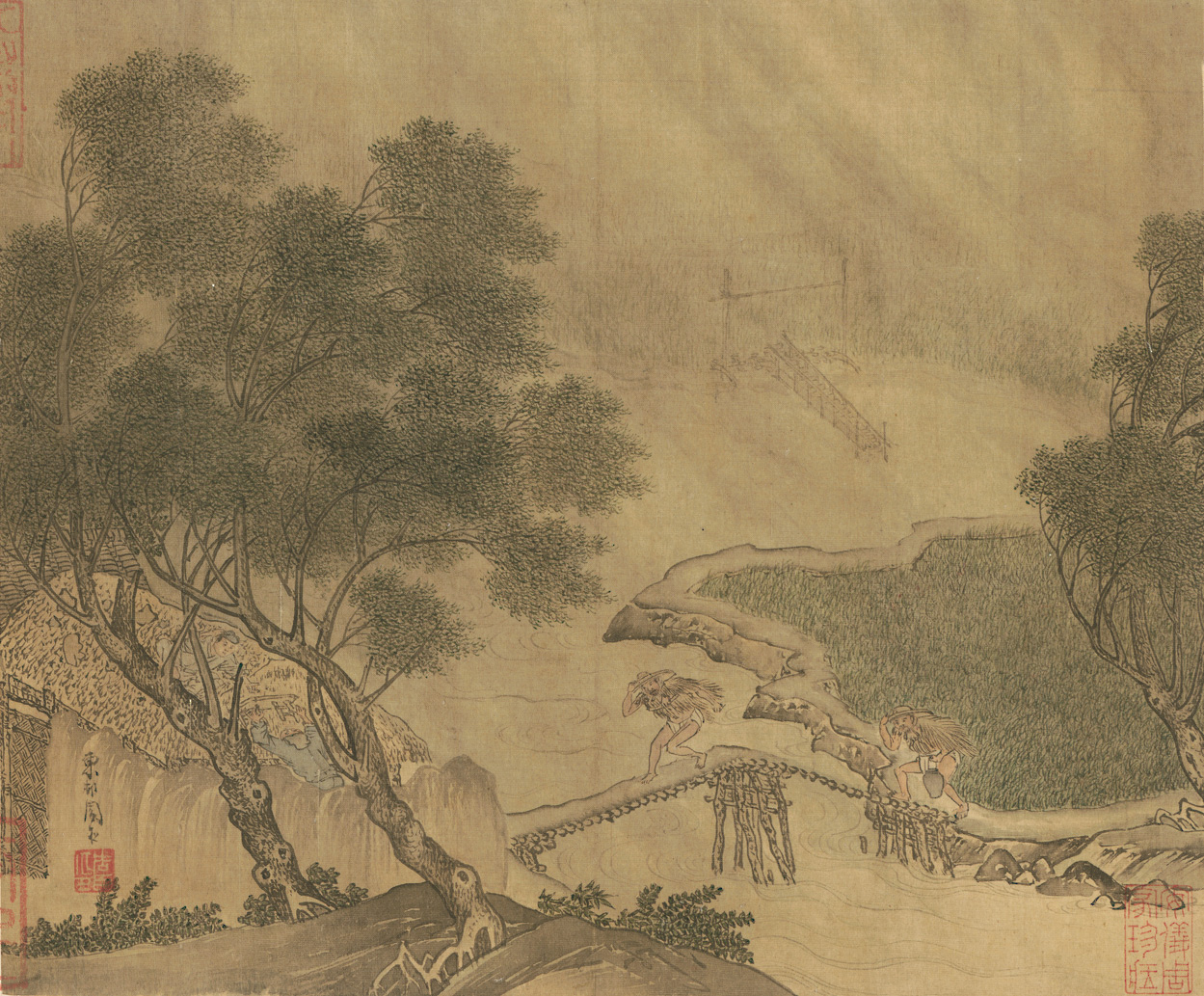 此选自《四朝选藻•贞册》第八开,表现夏季大雨骤降、农夫仓皇回家的场景。图中人物线条简练,但情态生动,陂岸坡石用“斧劈皴”,用笔劲健,畦田树叶画法细致,布景空蒙,令观者如置身烟雨之中。画幅左下有作者款题“东村周臣”,钤“周臣印”白文印。