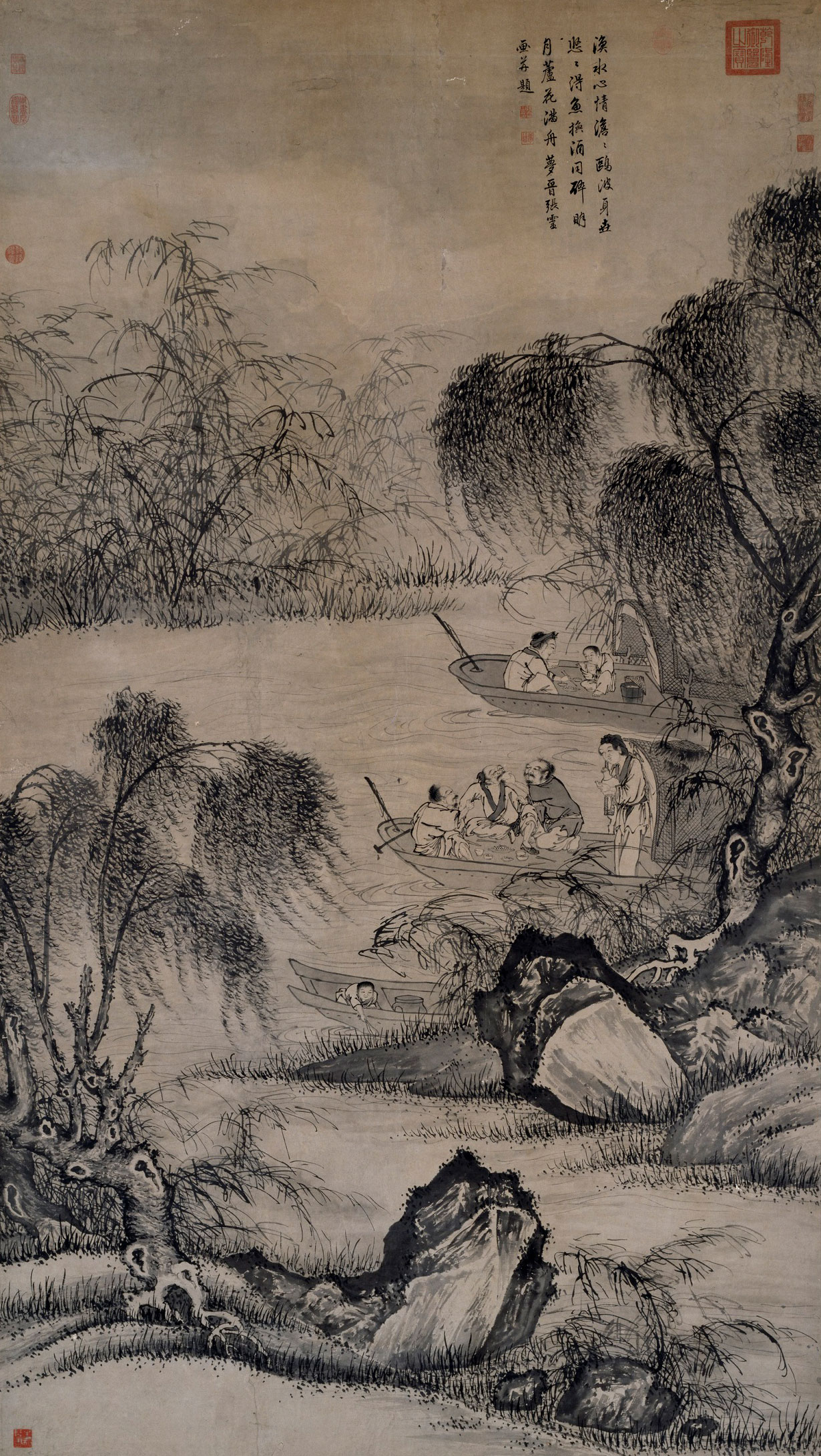图绘渔夫夏景闲时饮酒场景,舟泊水涯,柳叶轻飏,渔夫聚饮为乐,生活意趣盎然。人物衣纹简放,眉目清晰传神,山石用“斧劈皴”,笔墨苍润遒劲,竹枝草叶以疾笔速写,兼具“浙派”风格,颇见画家狂放的气质。