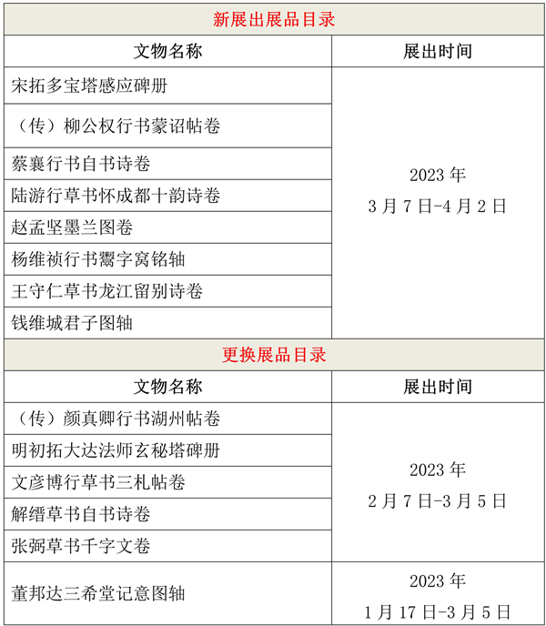 根据展览计划,出于文物保护的需要,包括(传)颜真卿《行书湖州帖》卷、文彦博《行草书三札帖》卷、解缙《草书自书诗》卷等五件文物将展出至3月5日(周日),次日撤展。
