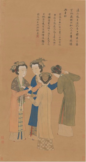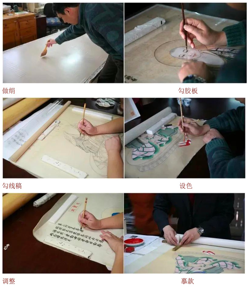 临摹技艺分为“临”与“摹”,二者有明确的标准要求。临,是指对照原作复制 并不追求完全的准确,取原作笔法、构图、颜色等大致风貌,以接近原作神韵为标准,会加入临摹者主观性理解,有再创造的因素。摹,则是完全遵照 原作,准确复原笔法、构图、赋色等画面内容,有完备的摹制流程,能深入 理解并掌握原作技法。摹的还原度比临更高,需要形神兼备。