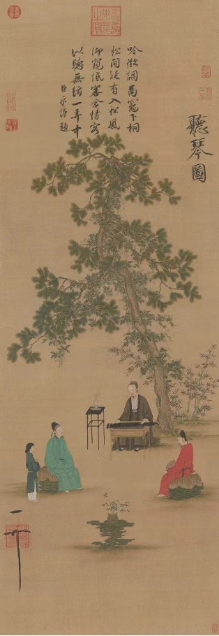 比如展品之一《听琴图》,它的设色展示了宋时古人设色的审美格调。这组 青色配黑色,再配一条白细边,足以显现出宋代审美的高雅。从帽子到帽子 边缘、灰色和肤色的关系,都处理得十分精准到位,需要靠墨色一遍一遍去 晕染,蕴含了非常高超精准的技法。摹制过程中会发现图的整个色调是相对饱和的状态,是一种含蓄、委婉的表达,耐看的同时也有精神和想象力的延 伸,是中国传统绘画设色的一种独特魅力。