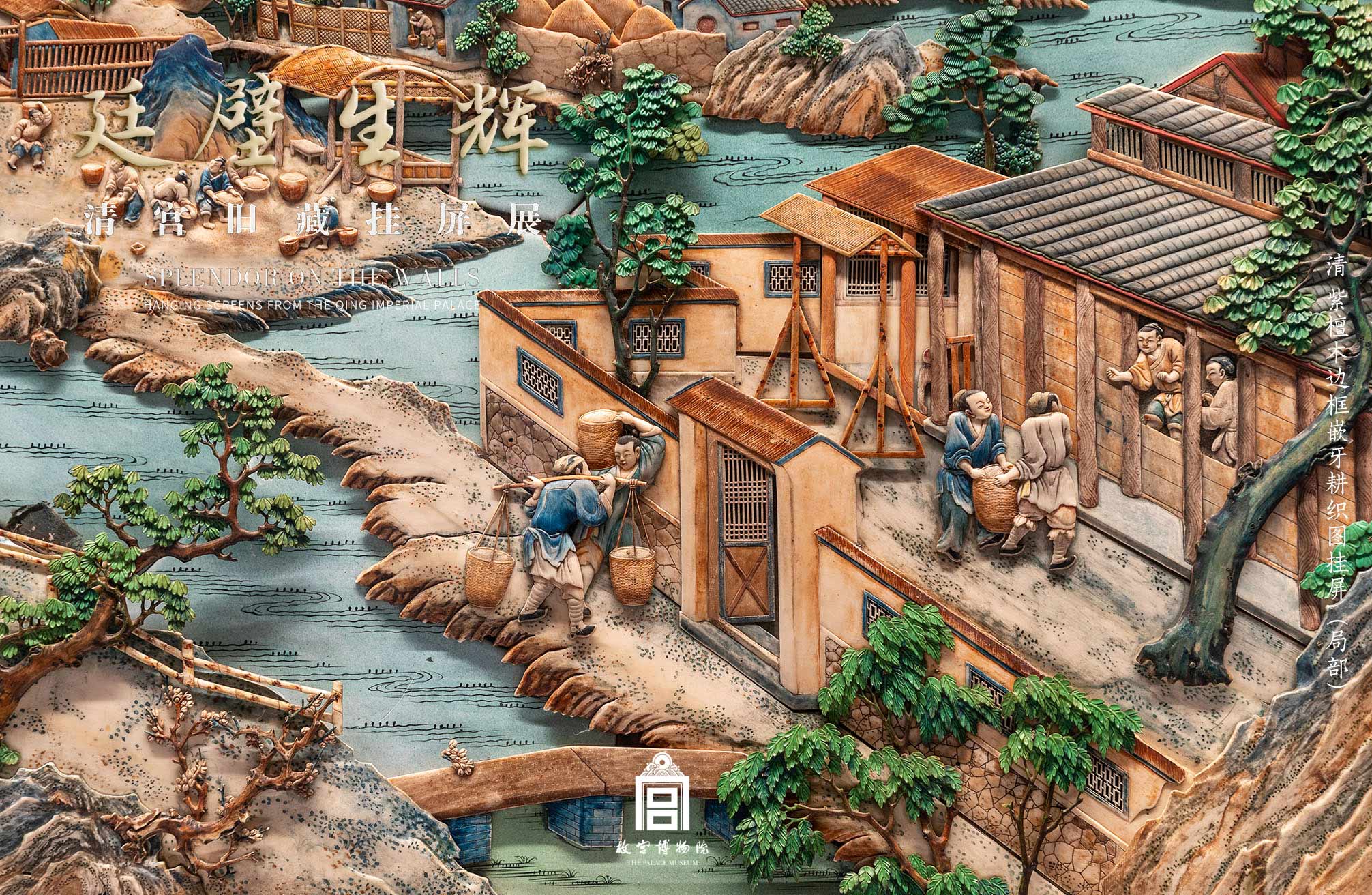 本次展览是清宫挂屏首次以专题的形式呈现,为使广大观众更好地了解其背后所蕴含的艺术文化价值,展览以题材为线索,工艺为阶梯,选取有代表性的挂屏及相关书画文物,共六十余件。其中既有“缂金线山庄果园图”这样少见的金线缂织画作品,也有意蕴雅致的“嵌银片梅杏图”挂屏。而将书画原作以不同工艺形式的挂屏加以再现,如“明皇试马图”、“鸡雏待饲图”等系列,则体现出居安思危、治国临民的思考。可以说,挂屏的功能虽以装饰为主,但并不止于装饰。