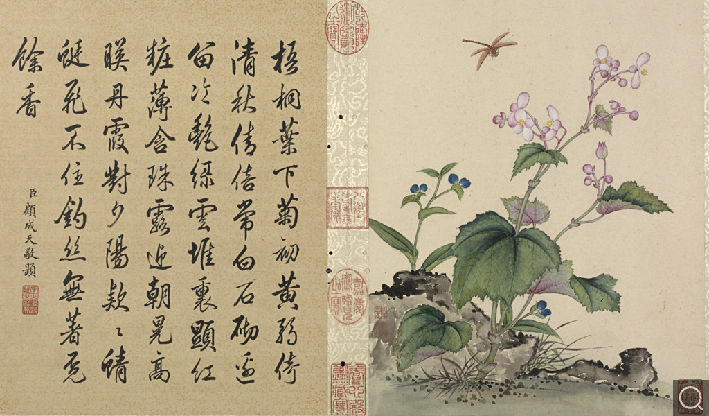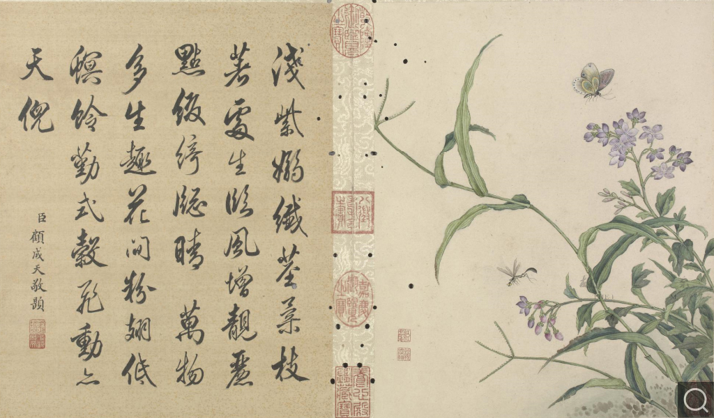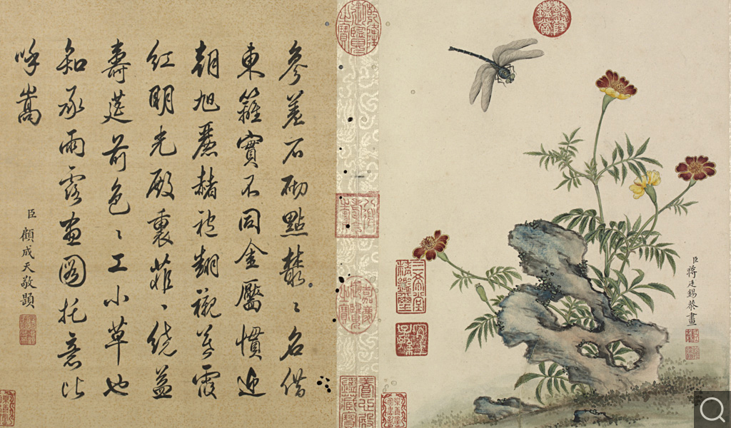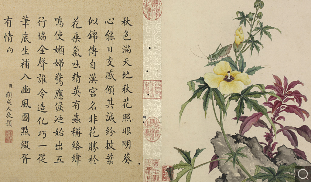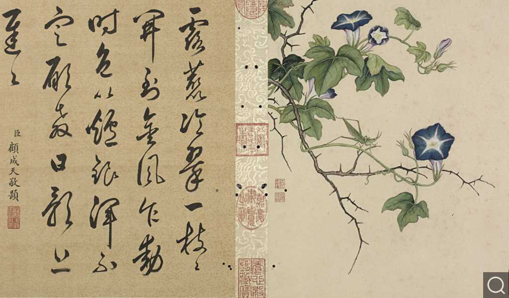 此册为十二开。分别画碧桃、竹枝;蟋蟀草、紫花;贴梗海棠;兰花;垂丝海棠;萱花、石竹;木香;秋海棠;蓝菊;秋葵;牵牛;万寿菊。本幅款署:“臣蒋廷锡恭画。“钤印“臣廷锡“朱文印,“朝朝染翰“朱文印。这是比较常见的臣子款落款和钤印的方式。此画的落款与蒋廷锡的亲笔绘画以及行书五言联结体和用笔均近似,只是更加工谨、严整,应为蒋廷锡自题。
