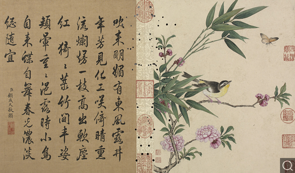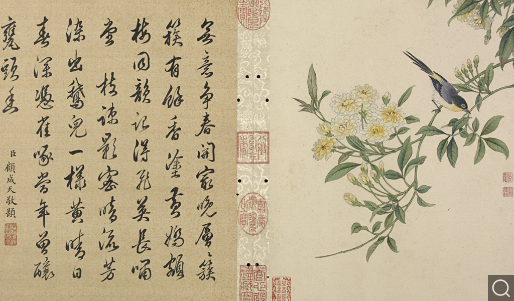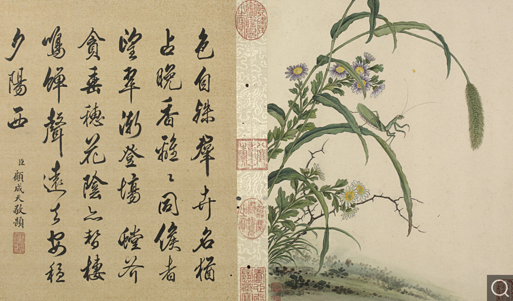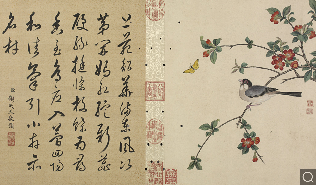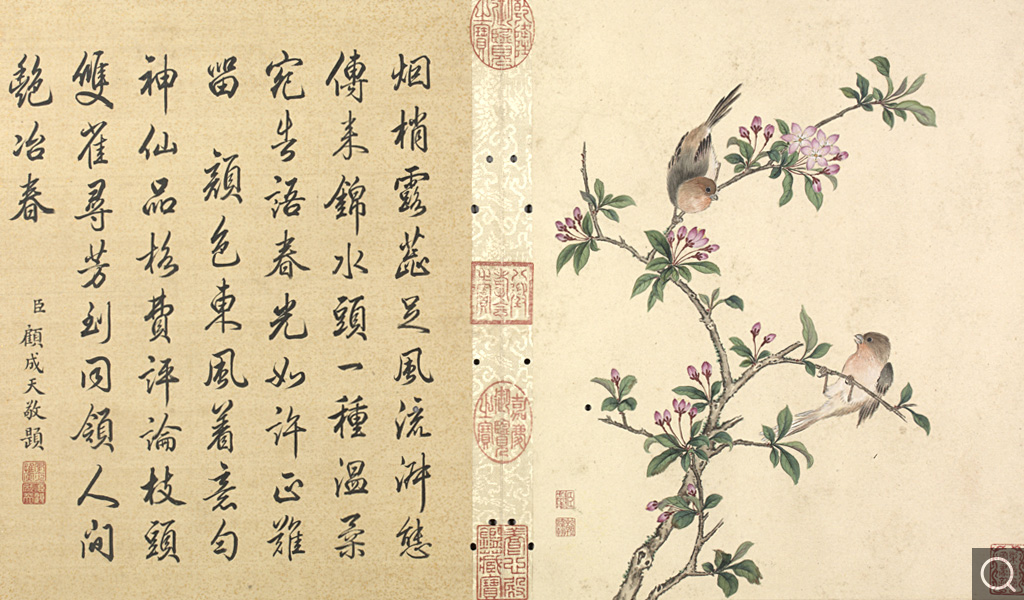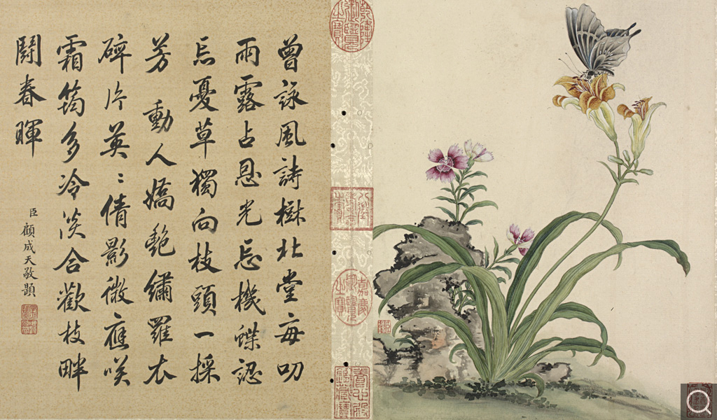 此册为十二开。分别画碧桃、竹枝;蟋蟀草、紫花;贴梗海棠;兰花;垂丝海棠;萱花、石竹;木香;秋海棠;蓝菊;秋葵;牵牛;万寿菊。本幅款署:“臣蒋廷锡恭画。“钤印“臣廷锡“朱文印,“朝朝染翰“朱文印。这是比较常见的臣子款落款和钤印的方式。此画的落款与蒋廷锡的亲笔绘画以及行书五言联结体和用笔均近似,只是更加工谨、严整,应为蒋廷锡自题。