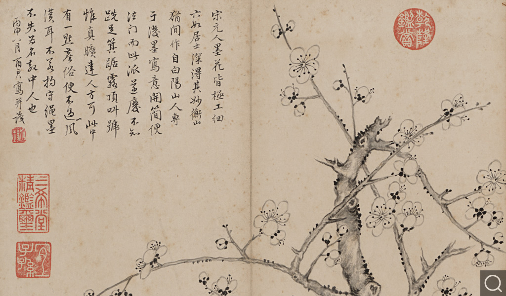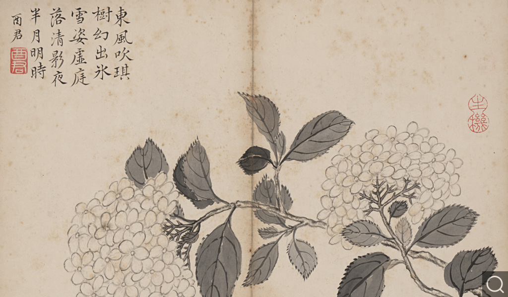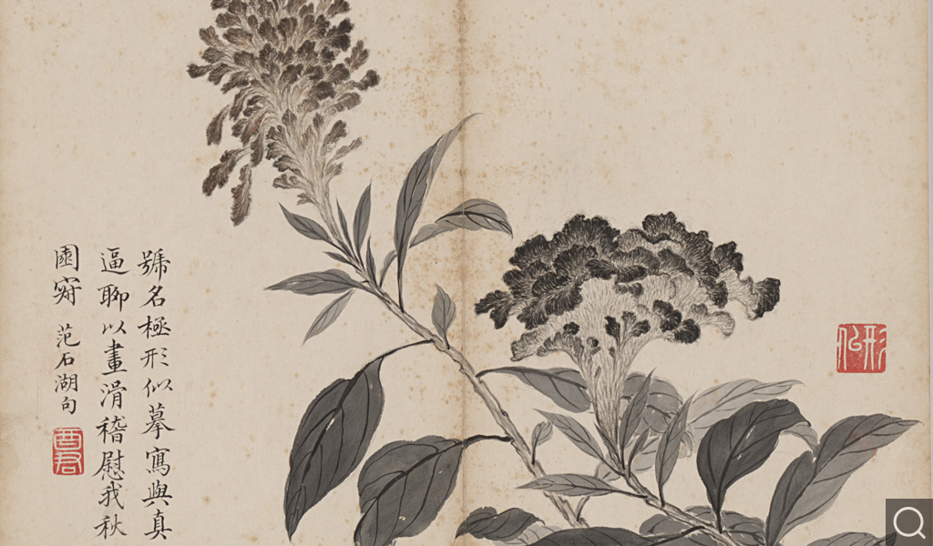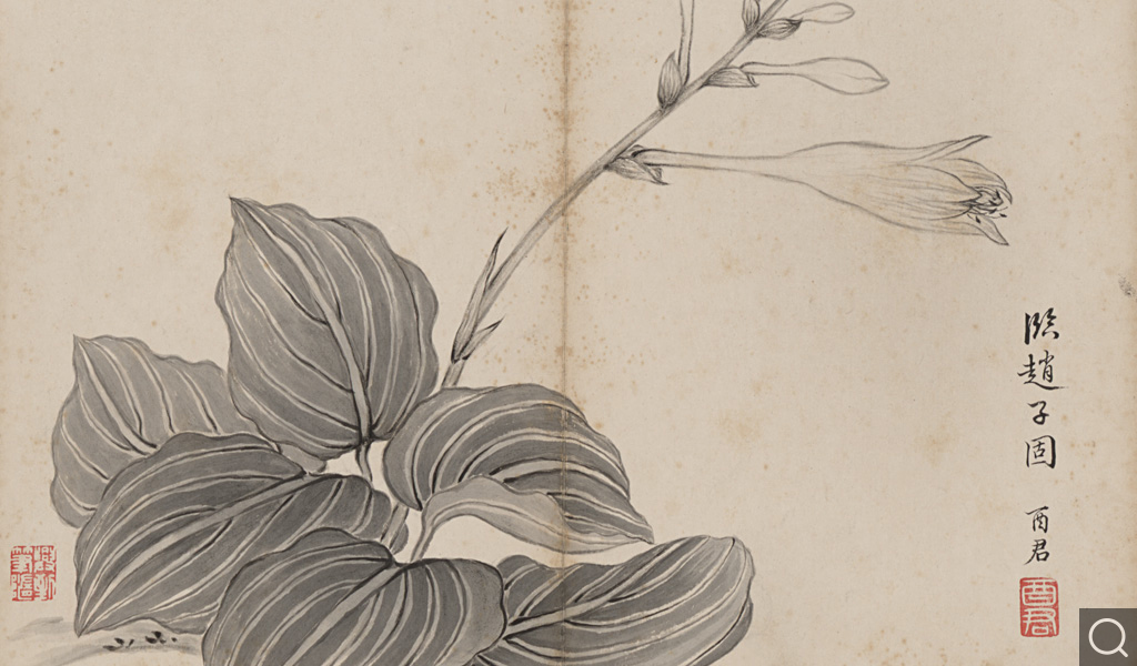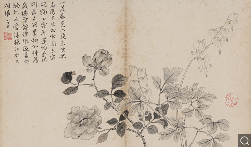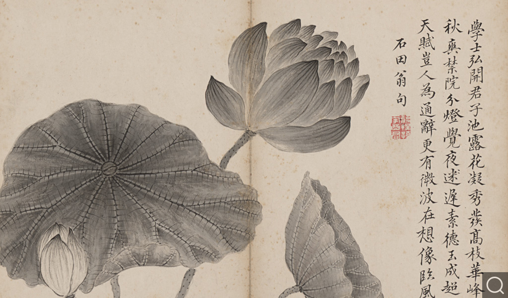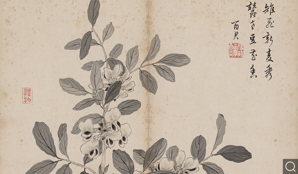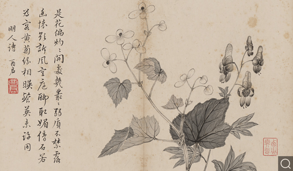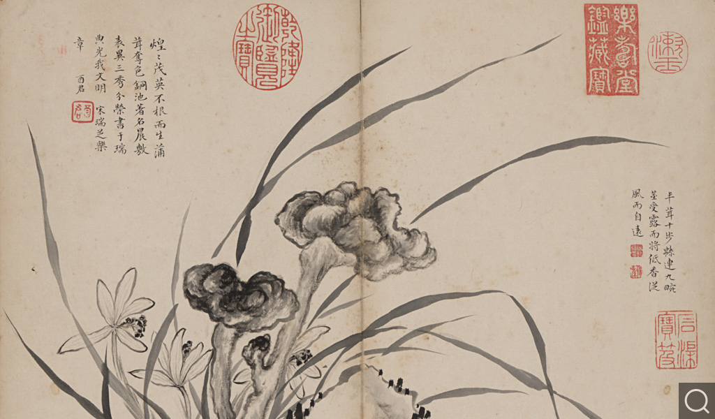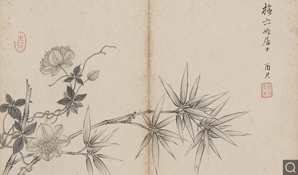 款署“丙申八月酉君写并识“,钤“廷锡“朱文印。丙申为康熙五十五年(一七一六),此年作者四十九岁。此册分别画兰花、荷花、竹子、荷花、梅花等,不刻意求工、求似,唯求自然天趣的笔墨,显现出蒋氏平淡超逸的审美意趣。例如一开绘兰、石、灵芝。兰是以文徵明法绘制的,兰叶向外柔和地伸展,呈随风而动飘逸之态。石与兰的静与动,在简约的画面中相互呼应,达到和谐。一开图绘竹枝与牵牛花,枝干蜿蜒的牵牛花向左,叶片肥厚的竹向右取势。作者将本牵牛花与竹有机地相结合成为一个整体。牵牛花姿态妩媚、柔婉,竹干挺拔刚健,显现出其高标清韵的格致。一开画梅花,图中的梅花以墨笔圈线为瓣,线条细劲圆润,具有“暗香浮动“的诗意。画史中称蒋氏画风:“自然恰合,风神生动,意度堂堂。“此册可谓得之。