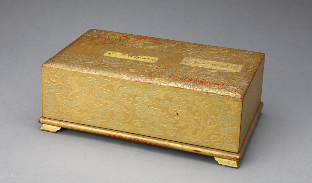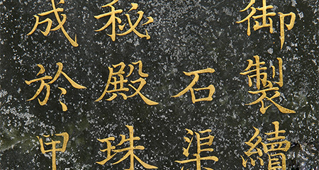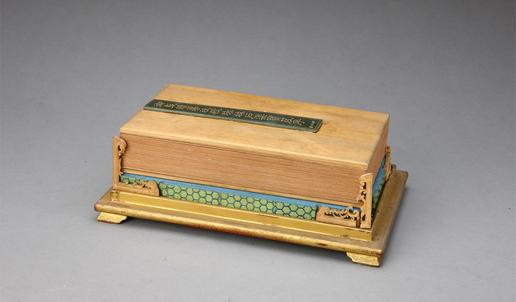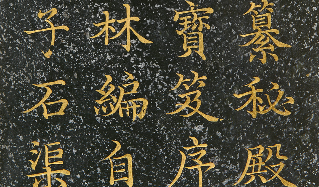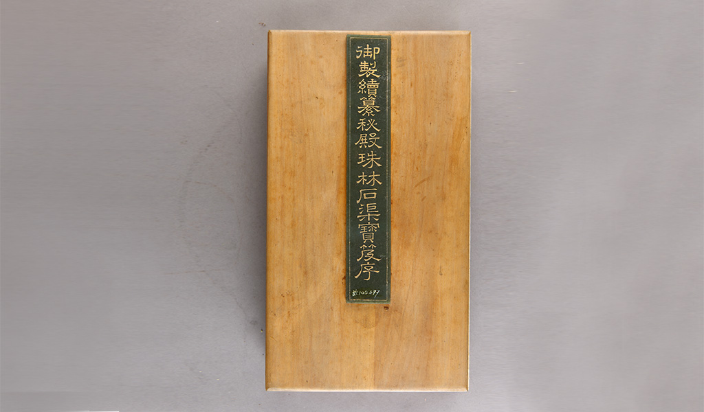 碧玉“御制续纂秘殿珠林石渠宝笈序”册,文字为浅刻描金,一册六页。册以玉版为册心,装帧成书籍形式,并盛于金漆匣内。册原文收录于乾隆御制文集三卷九。乾隆时期常令人将其御制诗文中一些得意之作制成玉册,置于左右把玩欣赏,以求自娱。