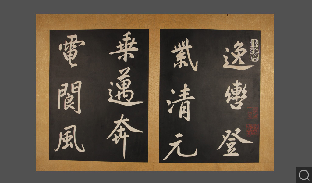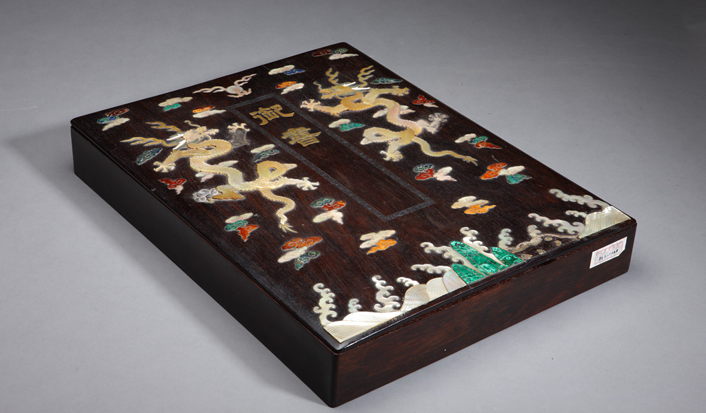 本件织锦帖面,正面金线织造双龙,下为福山寿海。封底织立龙及银锭、如意纹饰,龙身鳞片生动,虎掌、鹰爪,用火焰、珠光衬托出威严。寓意江山永固,财富、长寿之意,做工精湛,造型灵动,精美绝伦。并附有一“百宝嵌”木盒。木盒用精心选料的紫檀做成,其上嵌螺钿、青金石、孔雀石等构成二龙戏珠捧“御书”二字及海水江崖、如意云纹图案。“御书”字用铜镀金,周围镶银丝回纹。