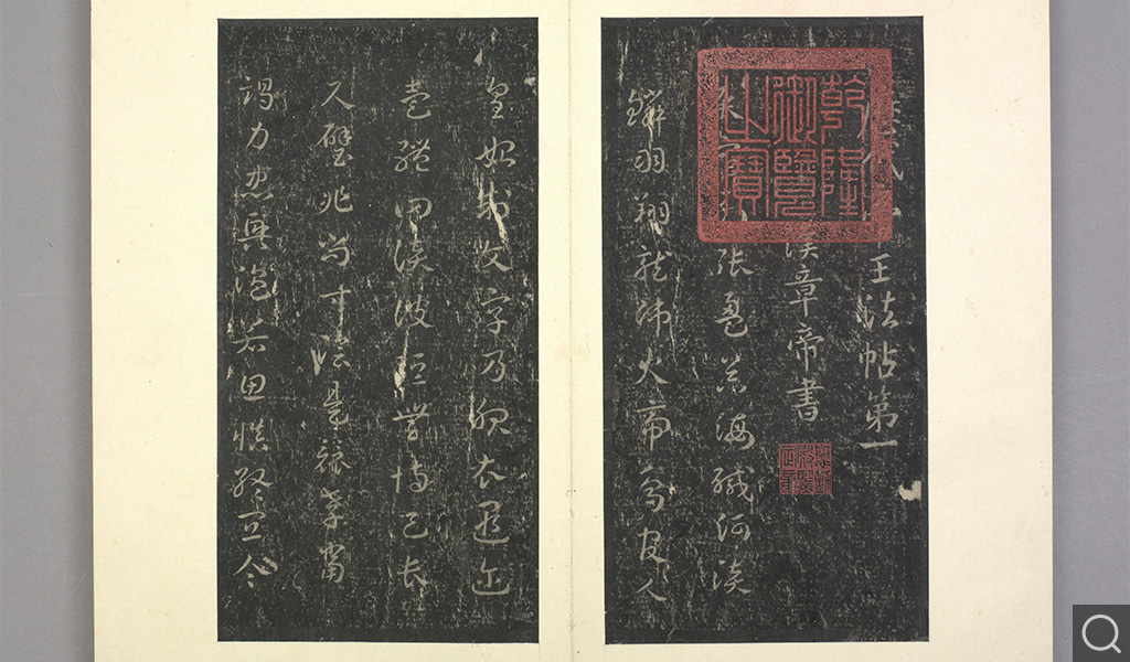 是帖以提梁木匣盛之,匣面刻填蓝色楷书“淳化阁帖,乾隆戊午鉴定宋拓”,填朱“石渠宝笈”“宝笈重编”二印。按照木匣上刻字,乾隆戊午年为乾隆三年(一七三八),说明至少乾隆三年时这部帖已在宫中。《石渠宝笈续编》著录“鉴藏宝玺七玺”全,但帖中未见“七玺”。