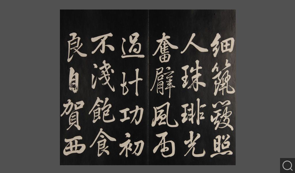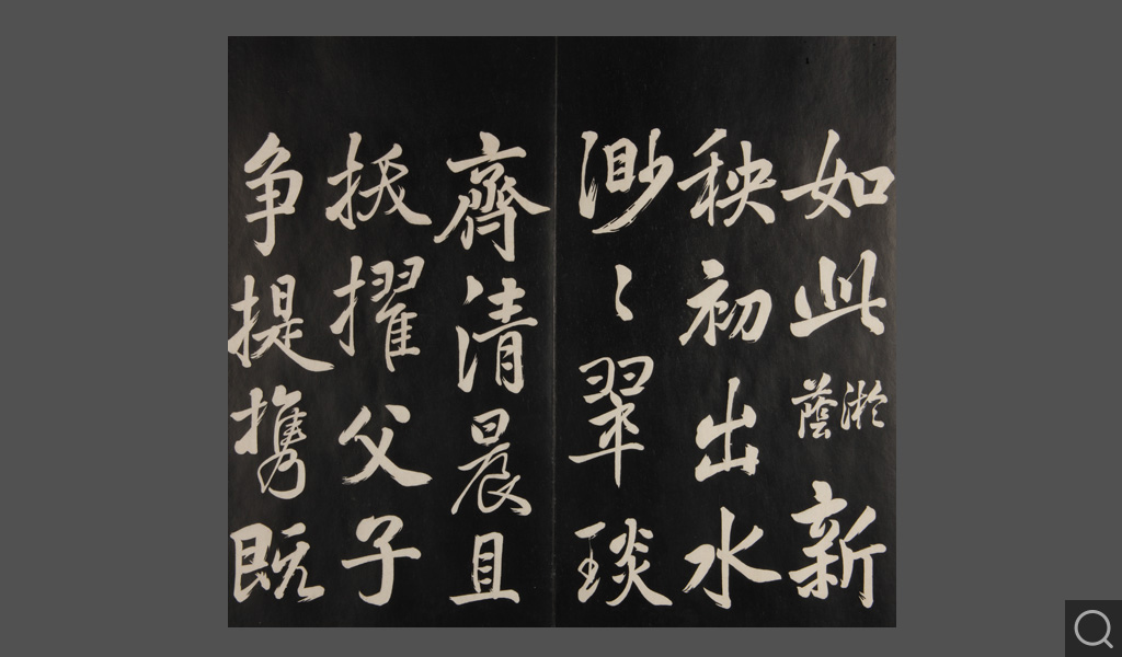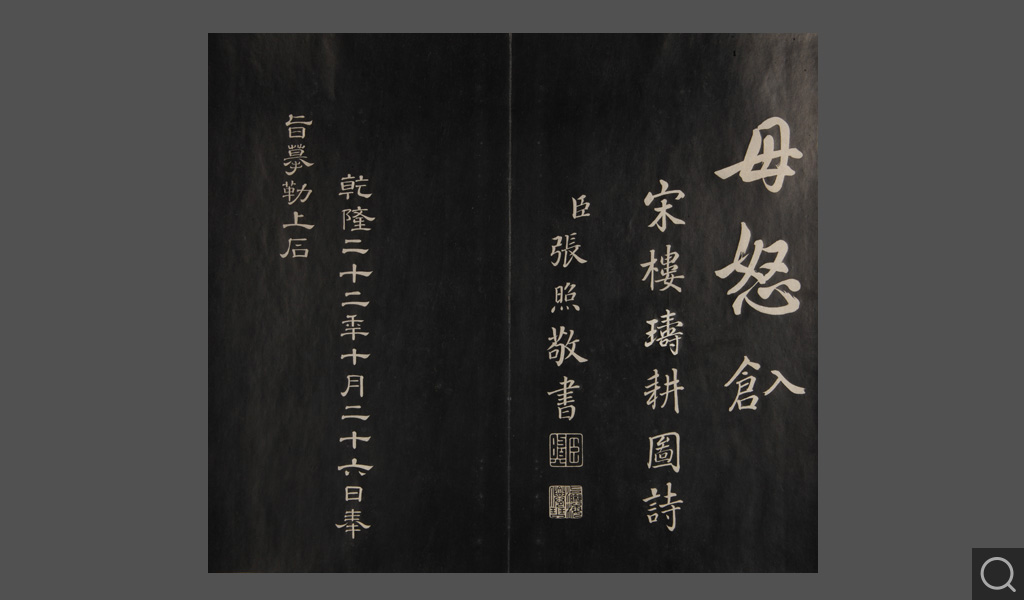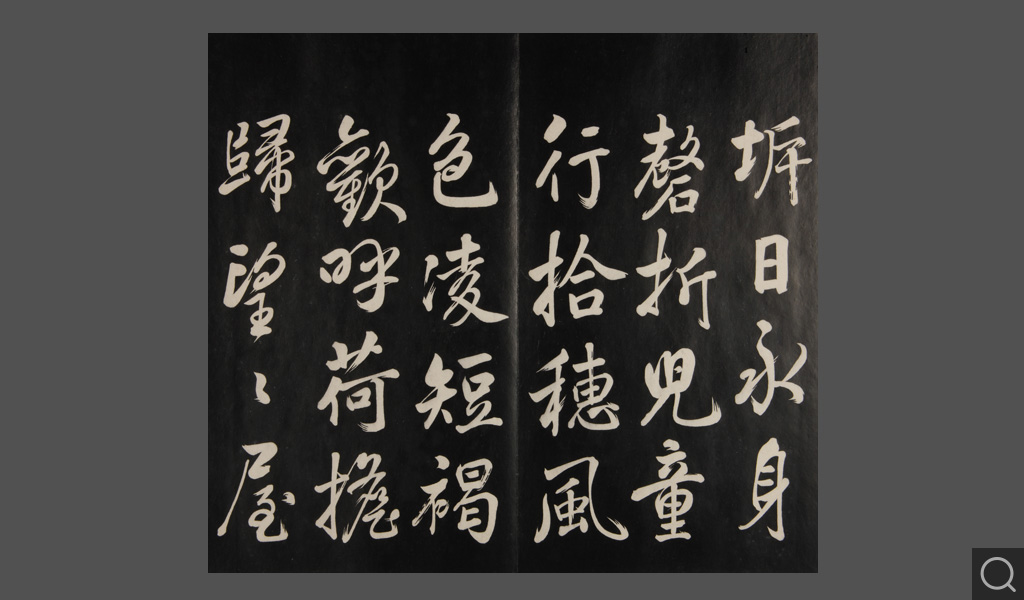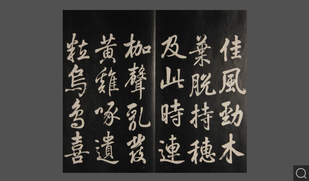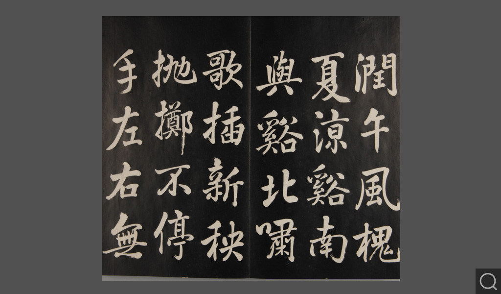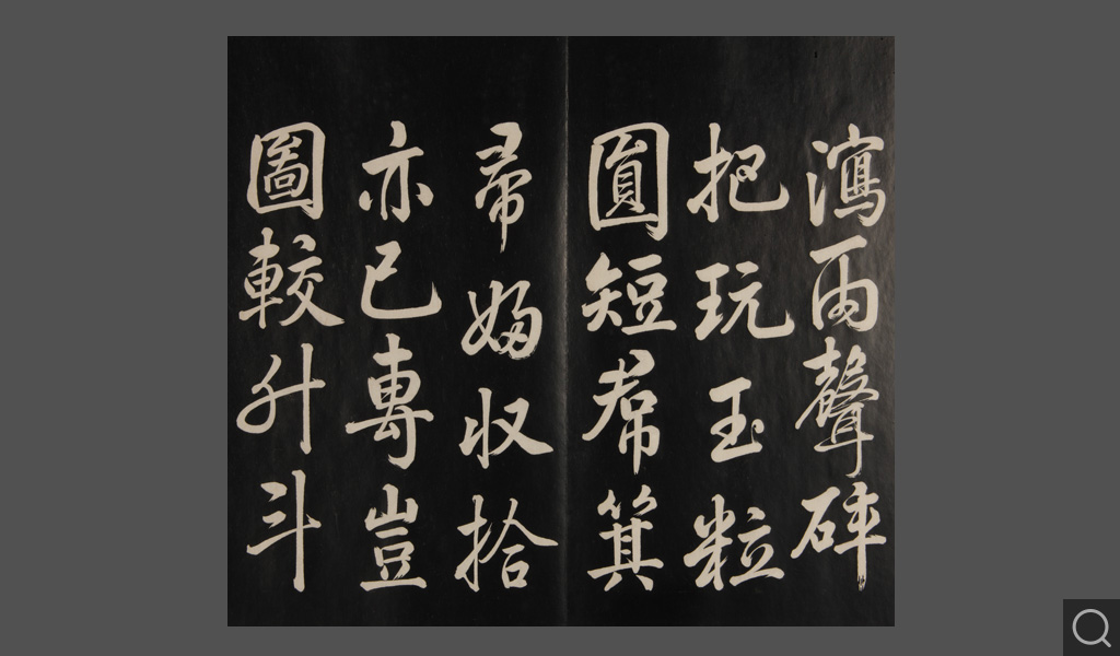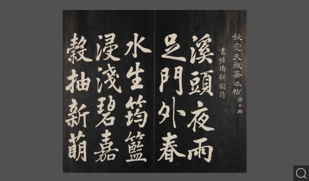 是件为清乾隆二十二年(一七五七)摹刻,帖收大臣张照书。该帖第一、二、三册收张照恭书御制诗文,第四、五、六、七、八册收张照临晋、唐、宋、元、明历代名家书,第九、十册收张照自书诗文。