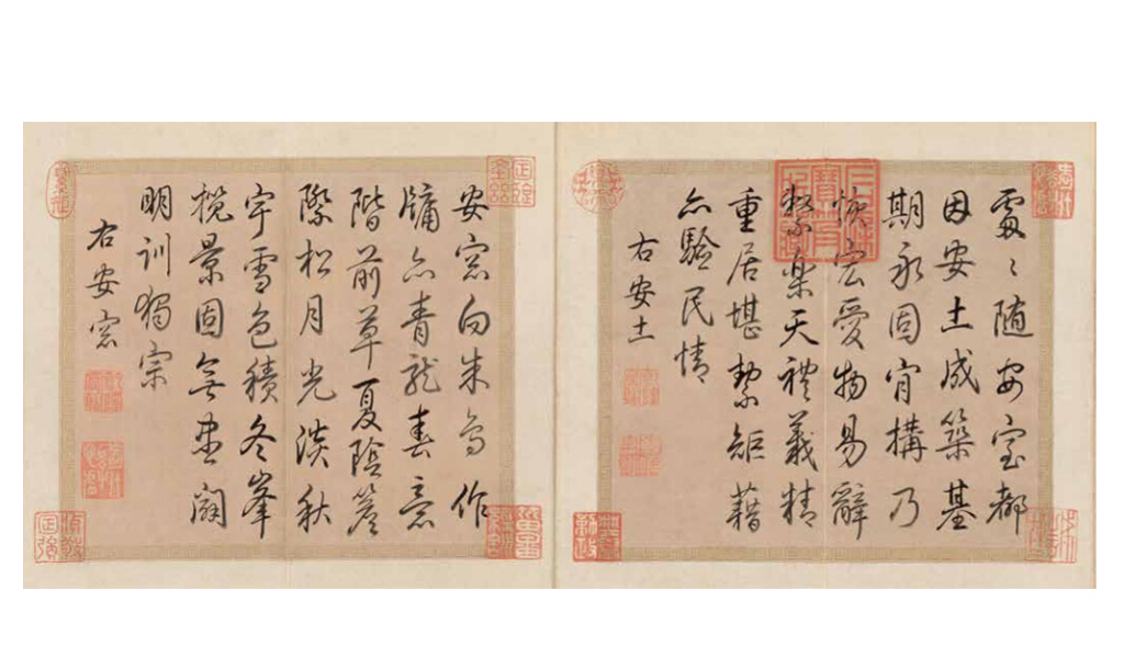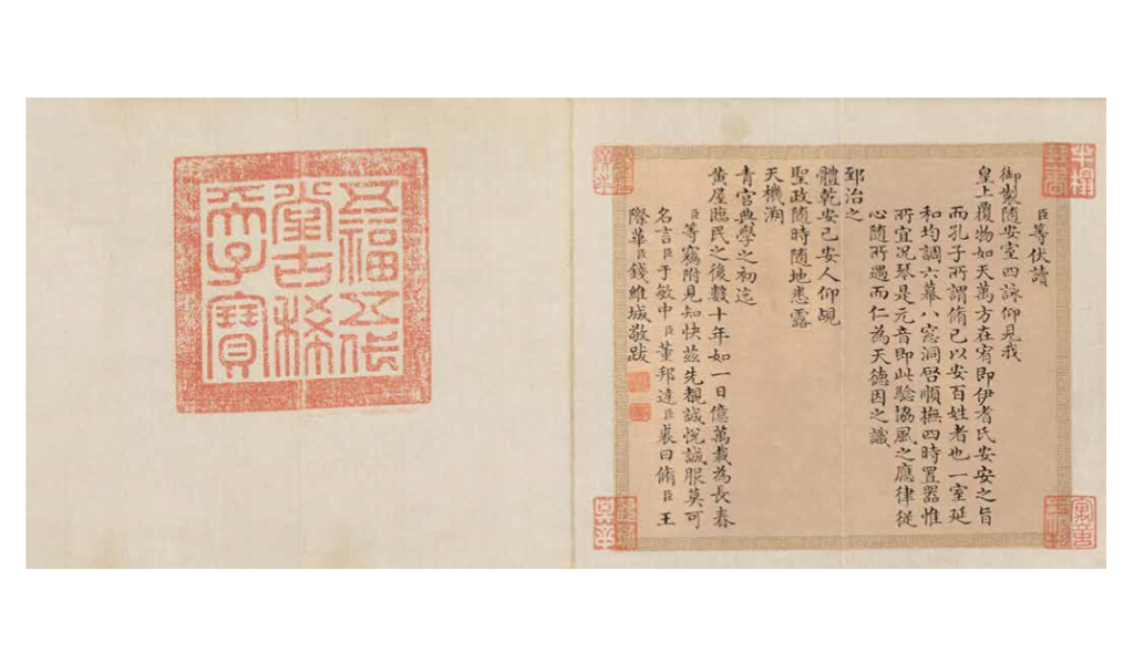 此册配以上下夹板,其上金字隶书“御笔随安室四咏”。本幅书《咏随安室诗》四首,分别为安土、安窗、安琴、安仁。其后于敏中、董邦达、裘曰修、王际华、钱维城跋。