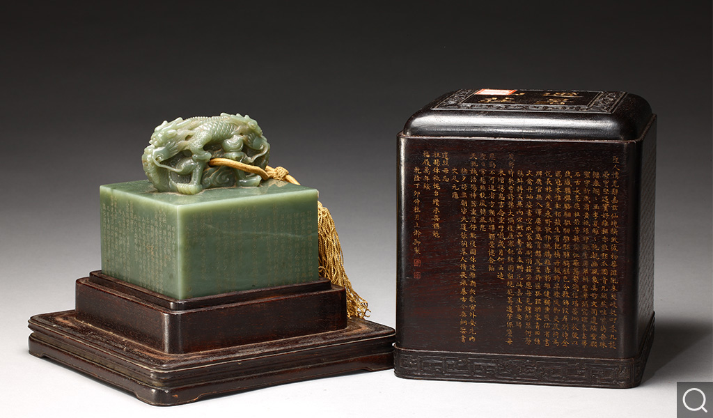 印为碧玉交龙纽正方形,阳文篆书。印台四周浅刻乾隆御制诗。此宝附紫檀木云龙匣,匣四面阴刻避暑山庄诗并描金。