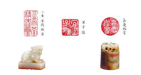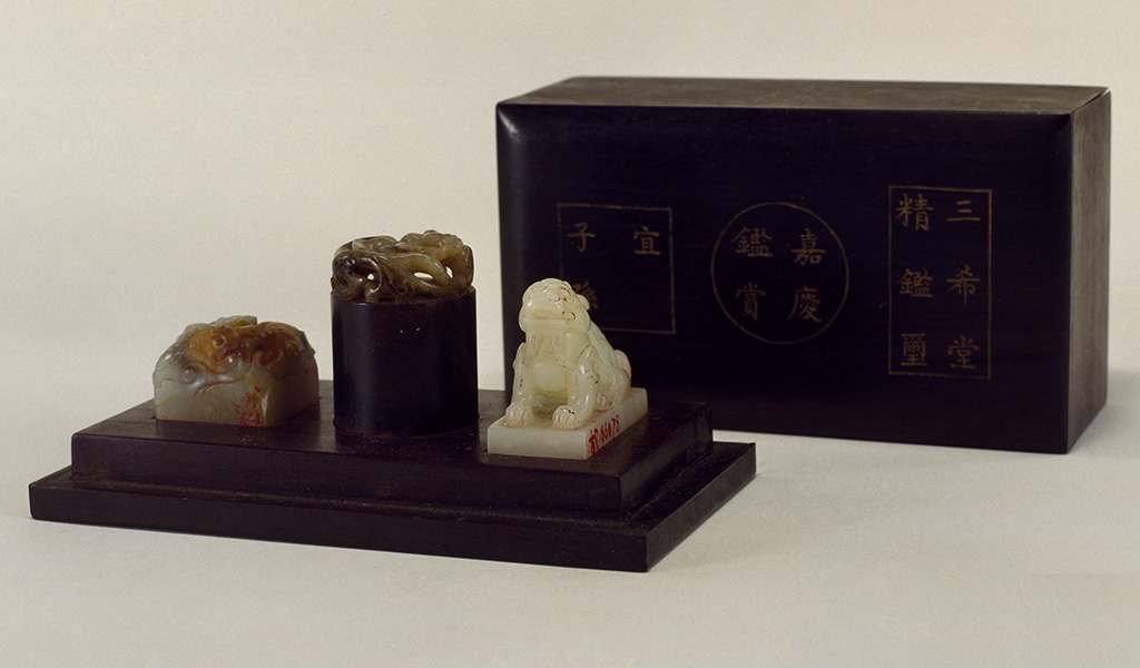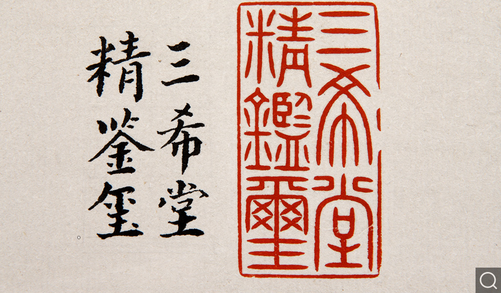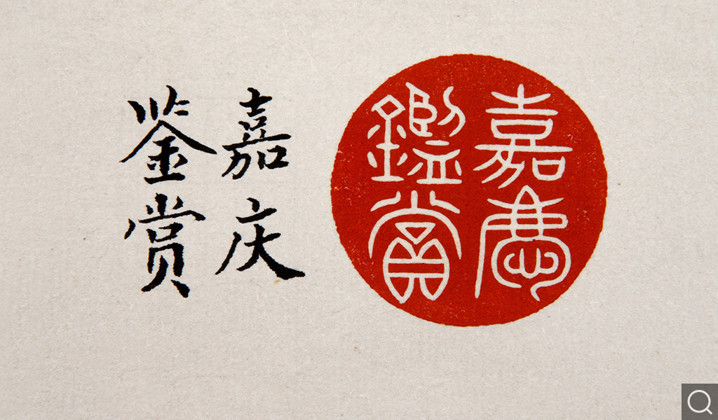 此三玺为嘉庆帝著名的鉴藏类宝玺,相互配套使用,共贮于一紫檀木匣内。三玺主要钤盖于《石渠宝笈》《秘殿珠林》三编著录过的书画作品之上,具体使用情况在《石渠宝笈》《秘殿珠林》三编的“凡例”中有明确说明。三编“凡例”载:“初编、续编各件书画后皆列鉴藏宝玺一条,兹一遵其例……古今臣工书画则用嘉庆御览之宝、嘉庆鉴赏、三希堂精鉴玺、宜子孙,或曰秘殿珠林,或曰石渠宝笈,凡五玺。又加珠林三编或宝笈三编一玺,以示别于续编。”可知被《石渠宝笈》《秘殿珠林》三编著录过的古今臣工的书画作品上都钤有嘉庆的这套“嘉庆鉴赏”“三希堂精鉴玺”和“宜子孙”玺。很显然,嘉庆皇帝的这套宝玺完全仿自乾隆帝的“三希堂精鉴玺”组玺,但二者细微之处仍有所差别,这是鉴别清宫书画收藏著录情况最明显的标志之一。